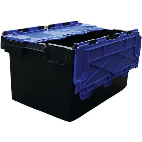 Strong interlocking lids made of plastic. The black base is made of 100% recycled plastic. Strong containers with coloured lids for easy separation. Features easy-grip handles to assist with lifting. The storage box can be stacked or nested when not in use to save space. Impact resistant. Ideal for storage or distribution.