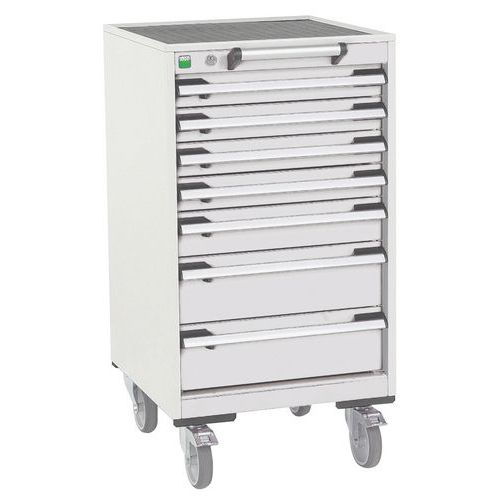Drawers with different heights give an organised, efficient method of storing tools or parts. The rubber top-tray reduces noise and protects delicate instruments. The cabinet has raised sides, to prevent items rolling off. Each drawer includes a safety trigger, which prevents accidental opening, and a drawer blocking mechanism, which prevents tipping. All drawers lock centrally and have 100% extension rails, for full access to the entire drawer. The push/pull ergonomic handle and four 125mm castors (2 fixed, 2 swivel-and-brake) give the cabinet excellent manoeuvrability and stability.