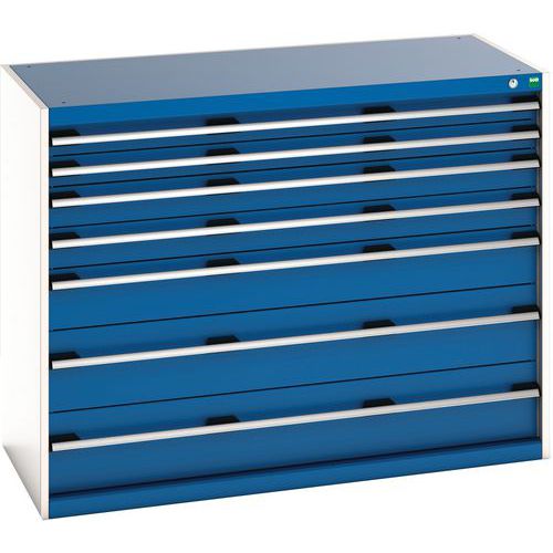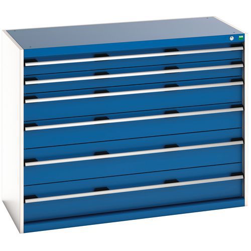 Different drawer sizes offer efficient storage for tools and parts. The drawers have a lock system that prevents more than one drawer from being opened at the same time. The 75kg UDL drawers have 100% roller bearing slides that open the drawers fully and smoothly, even if they are filled up. The central 3-point locking system offers superb security. The steel frame has a smart, powder-coated finish that is both resilient and professional in appearance. The ergonomic handle has a removable labelling strip and a transparent plastic cover. Delivered fully assembled. Dimensions measured as height, width, and depth: 1000 mm (height) x 1300 mm (width) x 650 mm (depth). Made in UK Max. load (kg) : 1500 Max. load (kg) : 1500