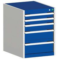 Different drawer sizes offer efficient storage for tools and parts. The drawers have a lock system that prevents more than one drawer from being opened at the same time. The 75kg UDL drawers have 100% roller bearing slides that open the drawers fully and smoothly, even if they are filled up. The central 3-point locking system offers superb security. The steel frame has a smart, powder-coated finish that is both resilient and professional in appearance. The ergonomic handle has a removable labelling strip and a transparent plastic cover. Delivered fully assembled. Dimensions measured as height, width, and depth: 700 mm (height) x 525 mm (width) x 650 mm (depth).
