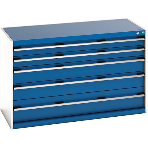 Different drawer sizes offer efficient storage for tools and parts. The drawers have a lock system that prevents more than one drawer from being opened at the same time. The 75kg UDL drawers have 100% roller bearing slides that open the drawers fully and smoothly, even if they are filled up. The central 3-point locking system offers superb security. The steel frame has a smart, powder-coated finish that is both resilient and professional in appearance. The ergonomic handle has a removable labelling strip and a transparent plastic cover. Delivered fully assembled. Dimensions measured as height, width, and depth: 800 mm (height) x 1300 mm (width) x 650 mm (depth). Made in UK Max. load (kg) : 1500 Max. load (kg) : 1500