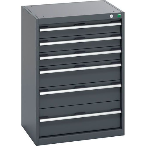 Different drawer sizes offer efficient storage for tools and parts. The drawers have a lock system that prevents more than one drawer from being opened at the same time. The 75kg UDL drawers have 100% roller bearing slides that open the drawers fully and smoothly, even if they are filled up. The central 3-point locking system offers superb security. The steel frame has a smart, powder-coated finish that is both resilient and professional in appearance. The ergonomic handle has a removable labelling strip and a transparent plastic cover. Delivered fully assembled. Dimensions measured as height, width, and depth: 900 mm (height) x 650 mm (width) x 525 mm (depth).