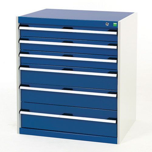 Different drawer sizes offer efficient storage for tools and parts. The drawers have a lock system that prevents more than one drawer from being opened at the same time. The 75kg UDL drawers have 100% roller bearing slides that open the drawers fully and smoothly, even if they are filled up. The central 3-point locking system offers superb security. The steel frame has a smart, powder-coated finish that is both resilient and professional in appearance. The ergonomic handle has a removable labelling strip and a transparent plastic cover. Delivered fully assembled. Dimensions measured as height, width, and depth: 900 mm (height) x 800 mm (width) x 525 mm (depth). Made in UK