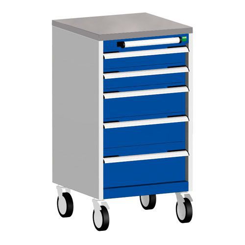 Mobile and heavy-duty, with a reinforced steel housing offering a 300kg UDL. The drawers all have a robust 50kg UDL capacity and full 100% extension rollers. Choose from three types of worktop that best suits your business: 1) a rubber worktop with raised sides to prevent roll-off, 2) a thick linoleum on particleboard core or 3) a multiplex beech ply worktop. The drawers have a locking mechanism, which prevents more than one drawer opening at once. A further safety-interlocking device prevents any drawer opening while in transit, even if unlocked. 125mm diameter rubber tyre castors, 2 fixed and 2 with swivel and brake control, for extra manoeuvrability.