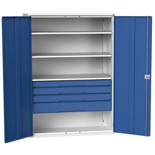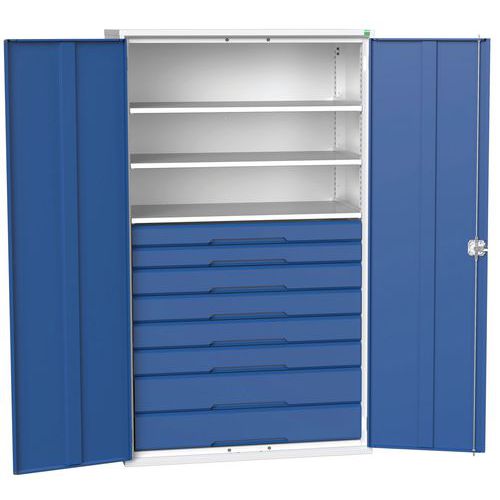 Reinforced and fully lockable doors, complete with a central 3 point locking system. The toughened drawers are equipped with a locking mechanism, to prevent more than one drawer opening at a time. The scuff-resistant steel shelves have a strong 75kg capacity. Welded steel housing, designed for frequent-use in industrial environments. Shelving is adjustable on a 25mm pitch. Delivered assembled and ready to use.