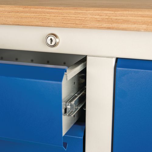 Move your tools and equipment right to the job with this mobile workbench, with four rubber 100mm diameter castors that have full swivelling action. The drawers and doors are reinforced and lockable, with a central 3 point locking system, for safety and security. 30mm thick MPX worktop of resin bonded, layered beech ply - hard-wearing and suitable for most benching applications. Scuff-resistant shelving is adjustable on a 25mm pitch and has an impressive 75kg UDL. All drawers and doors are reinforced and lockable, with a central 3 point locking system, for safety and security. The powder-coated finish is resilient and looks professional. The steel frame has a UDL capacity of 200kg.