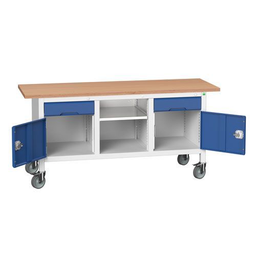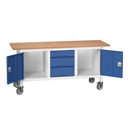 Move your tools and equipment right to the job with this mobile workbench, with four rubber 100mm diameter castors that have full swivelling action. 30mm thick MPX worktop of resin bonded, layered beech ply - hard-wearing and suitable for most benching applications. The extra-long, heavy-duty frame has a strong UDL capacity of up to 200kg. Scuff-resistant shelving is adjustable on a 25mm pitch and has an impressive 75kg UDL. The powder-coated finish is resilient and looks professional. All drawers and doors are reinforced and lockable, with a central 3 point locking system, for safety and security. The drawers have 100% roller bearing slides, allowing easy access to the entire drawer, even when full.