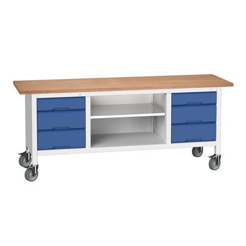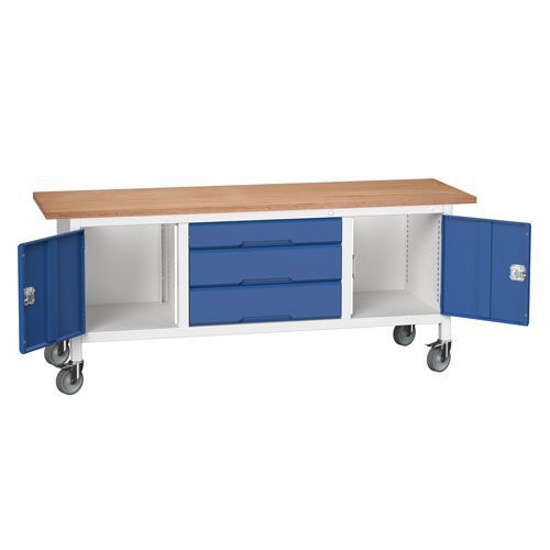 Move your tools and equipment right to the job with this mobile workbench, with four rubber 100mm diameter castors that have full swivelling action. 30mm thick MPX worktop of resin bonded, layered beech ply - hard-wearing and suitable for most benching applications. The extra-long, heavy-duty frame has a strong UDL capacity of up to 200kg. Scuff-resistant shelving is adjustable on a 25mm pitch and has an impressive 75kg UDL. The powder-coated finish is resilient and looks professional. All drawers and doors are reinforced and lockable, with a central 3 point locking system, for safety and security. The drawers have 100% roller bearing slides, allowing easy access to the entire drawer, even when full.