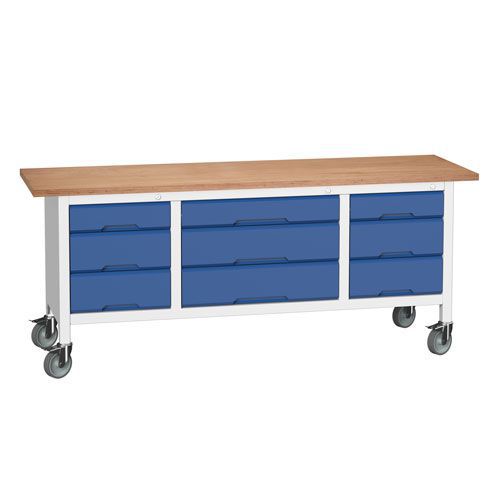Move your tools and equipment right to the job with this mobile workbench, with four rubber 100mm diameter castors that have full swivelling action. 30mm thick MPX worktop of resin bonded, layered beech ply - hard-wearing and suitable for most benching applications. The extra-long, heavy-duty frame has a strong UDL capacity of up to 200kg. Scuff-resistant shelving is adjustable on a 25mm pitch and has an impressive 75kg UDL. The powder-coated finish is resilient and looks professional. All drawers and doors are reinforced and lockable, with a central 3 point locking system, for safety and security. The drawers have 100% roller bearing slides, allowing easy access to the entire drawer, even when full. Made in UK Max. load (kg) : 200