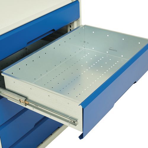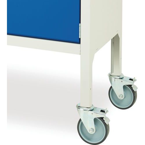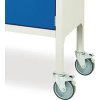 Mobile and designed for industrial use, with a reinforced steel housing offering a 200kg UDL. Differently sized drawers promote the efficient storage of tools and parts. The drawers all have a robust 50kg UDL capacity and full 100% extension rollers. The rubber worktop deadens noise, protects delicate parts for impacts and has raised sides to prevent roll-off. The drawers have a locking mechanism, which prevents more than one drawer opening at once. A further safety-interlocking device prevents any drawer opening while in transit, even if unlocked. 125mm diameter rubber tyre castors, 2 fixed and 2 with swivel and brake control, for extra manoeuvrability.