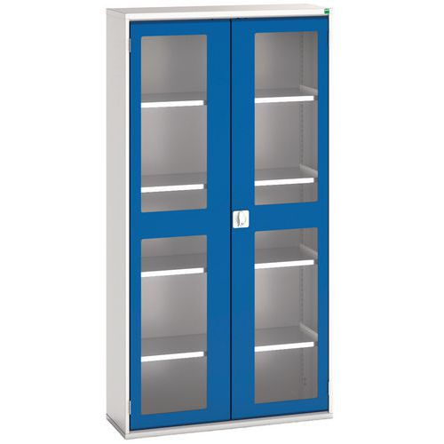 Robust 400kg UDL welded steel frame is perfect for industrial environments. Shelves have a galvanised steel construction, offering a top-line 75kg UDL. Shelves are also adjustable on a 23mm pitch, allowing extra flexibility to your storage. Epoxy powder-coated finish is robust and resistant to knocks and scratches. Shatter-resistant Perspex allows for quick stock and tool checks, without compromising security. Cylinder locking doors with 3 point locking. 10 year guarantee. Made in UK Max. load (kg) : 400 Max. load per shelf (kg) : 75