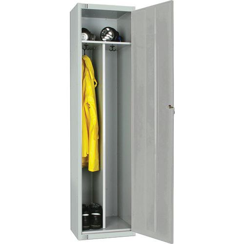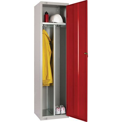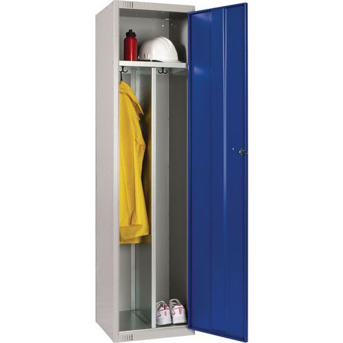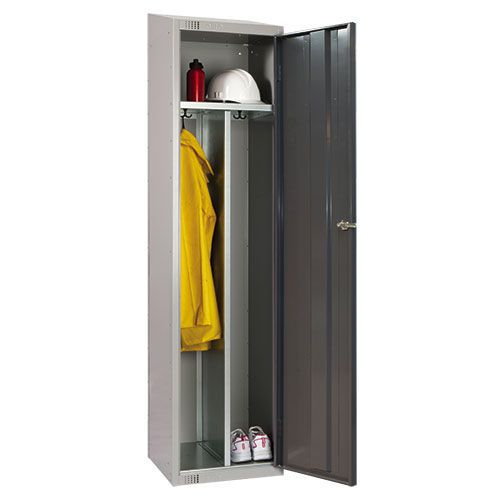 Hard-wearing steel locker with two vertical compartments.