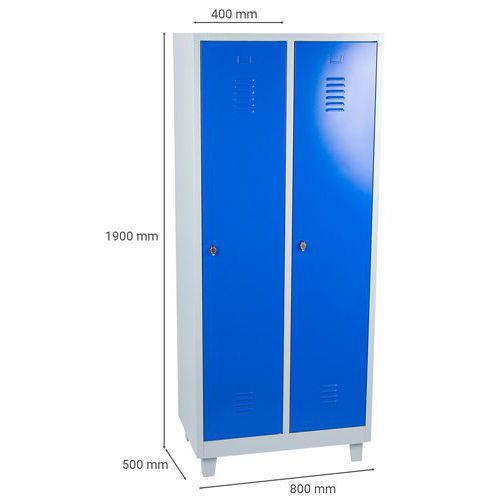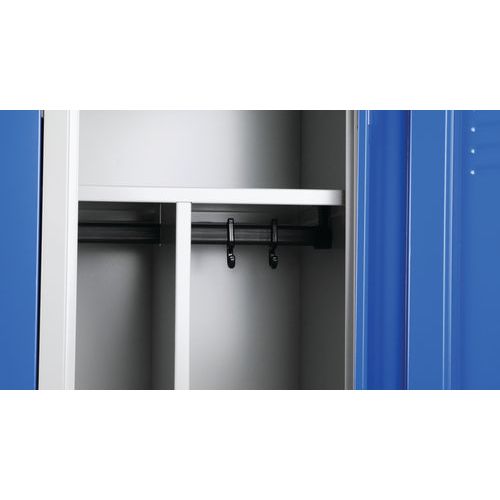 Dirty industry locker on feet with reinforced doors. Optimal 180° opening, attractive finish with concealed hinges. Clothes rail with partition for storing clean and dirty clothes separately. Holes for wall mounting and embossed label holder. Hygienic locker with ventilation at the top and bottom of the doors. Frame steel sheet thickness : 7/10e