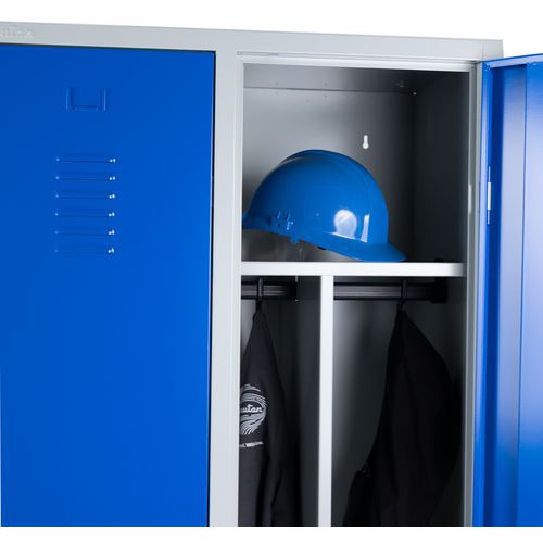 Dirty industry locker on feet with reinforced doors. Optimal 180° opening, attractive finish with concealed hinges. Clothes rail with partition for storing clean and dirty clothes separately. Holes for wall mounting and embossed label holder. Hygienic locker with ventilation at the top and bottom of the doors.