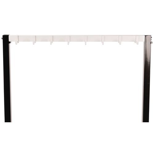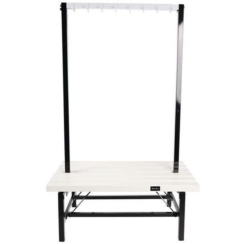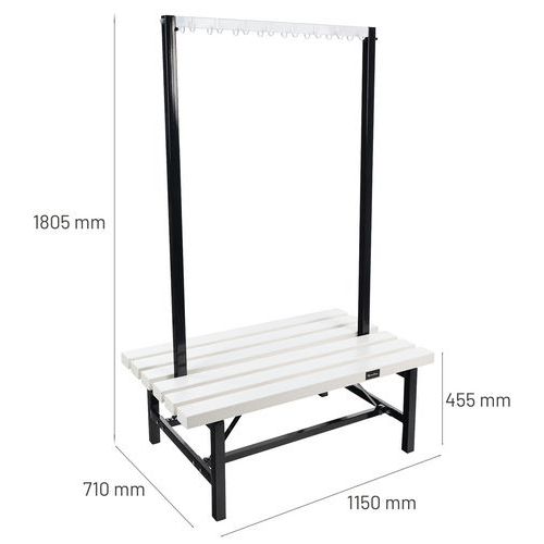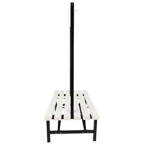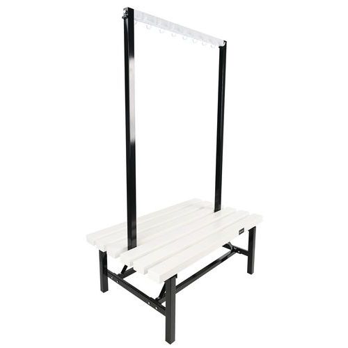 Double-sided PVC bench with hooks on both sides - Self-assembly - Manutan Expert Double-sided PVC bench with built-in hooks. Moisture-resistant white PVC structure that is easy to clean. Double-sided for optimum use in communal areas. Built-in hooks for hanging clothes or equipment. Ideal for changing rooms, break rooms and entrance halls.