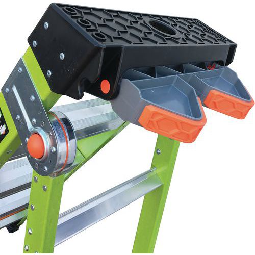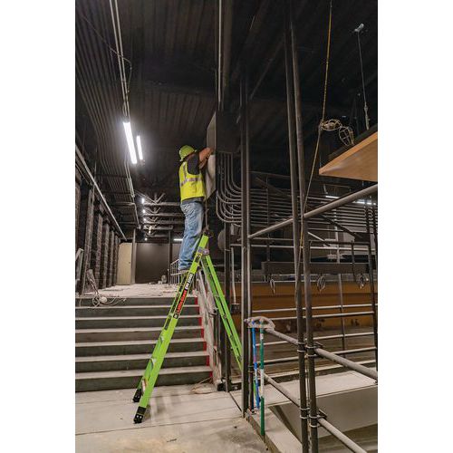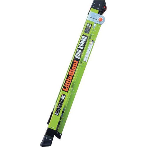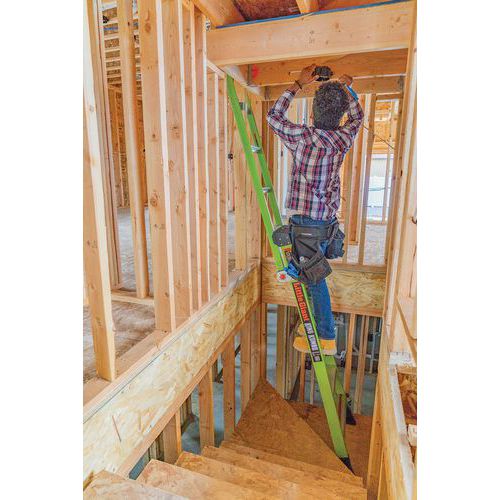 Extra heavy-duty feet with aggressive tread for the best traction. Tough corner, pole and stud gripping V-bar for the extension ladder. The straight side allows users to access tight workspaces between stud gaps, ceiling trusses and attic access ports. The heavy-duty grip fits inside and outside corners and even offers protection for damageable leaning surfaces such as paint, drywall and stucco. Non-conductive Hi-Viz green fibreglass makes the ladder more noticeable and safer from electrical discharges. There is a safety step on the bottom rung - the rung makes an audible “click”, letting the user know that they have safely reached the bottom. The wide-flared side offers excellent stability. 1-year warranty. A maximum load of 150kg. Conforms to the latest EN131 Professional safety standards. Max. load (kg) : 150