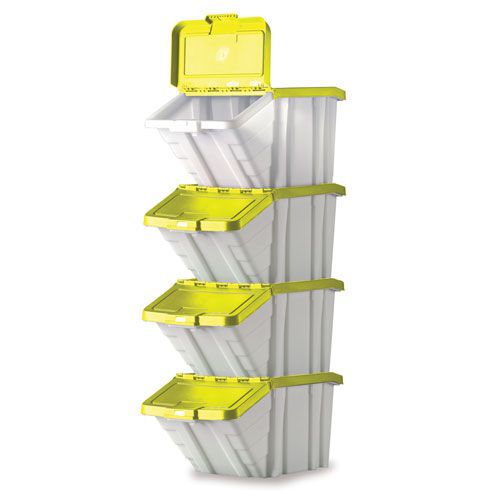 Robust, multi-functional sortable storage bins with multi-coloured lids.
