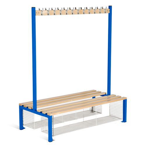 Double sided changing room benches supplied with double coat hooks. Optional shoe storage.