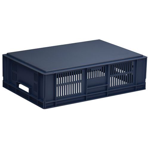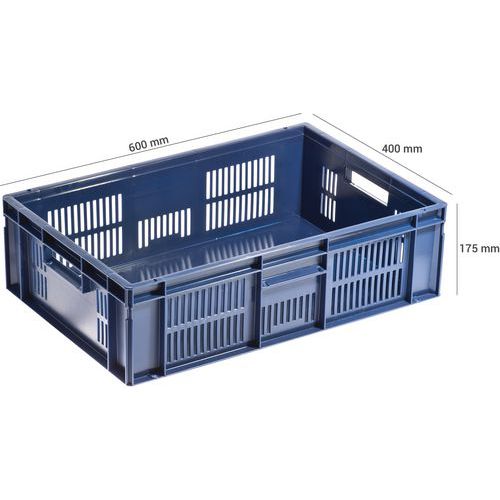 Blue European standard tray with good stacking stability. Openwork sides for guaranteed ventilation. Easy to move thanks to its large open handles. Resistance to oils, greases and many chemicals.