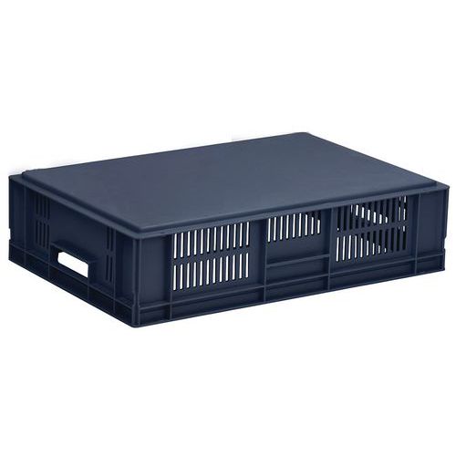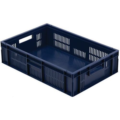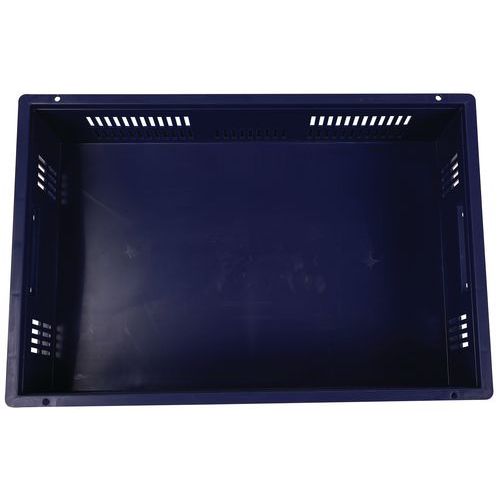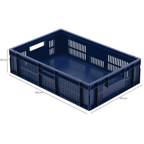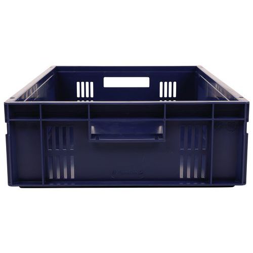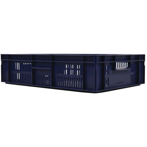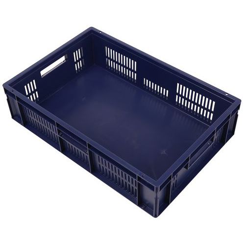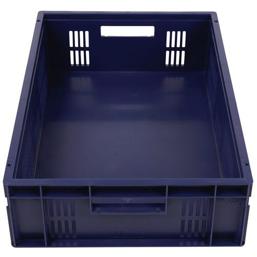 Blue European standard tray with good stacking stability. Openwork sides for guaranteed ventilation. Easy to move thanks to its large open handles. Resistance to oils, greases and many chemicals.