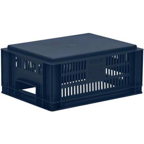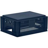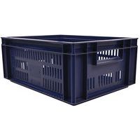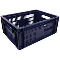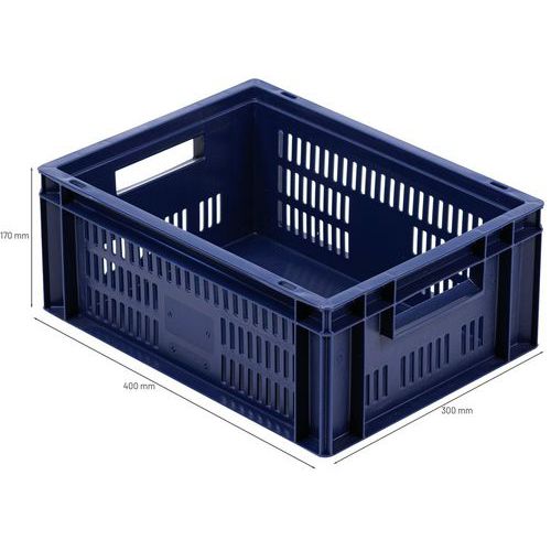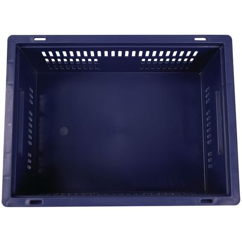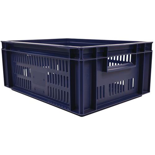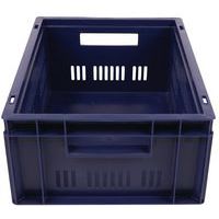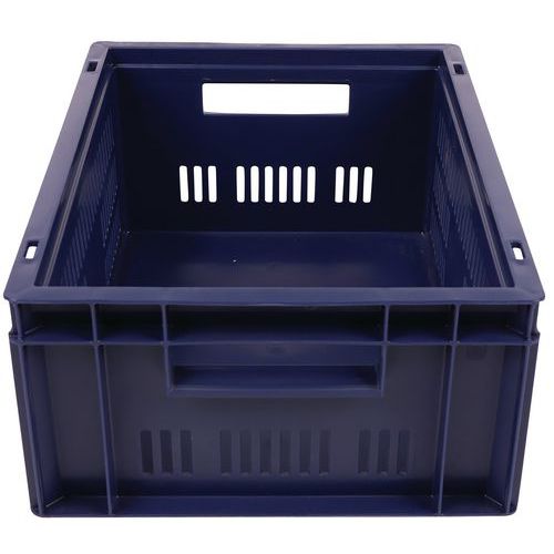 Blue European standard tray with good stacking stability. Openwork sides for guaranteed ventilation. Easy to move thanks to its large open handles. Resistance to oils, greases and many chemicals.