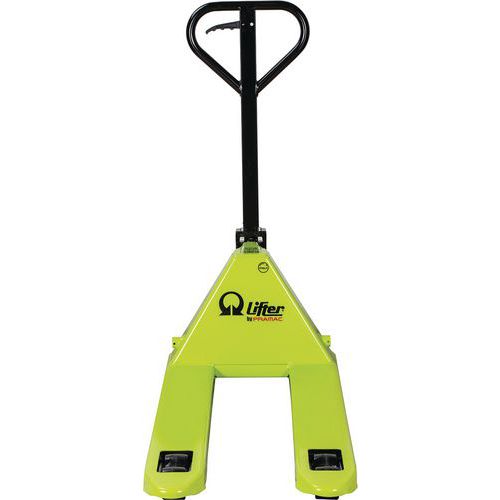 Pallet truck with 2500kg capacity and a cast iron housing.