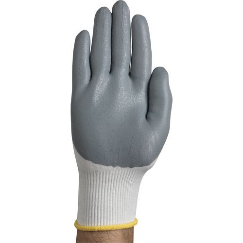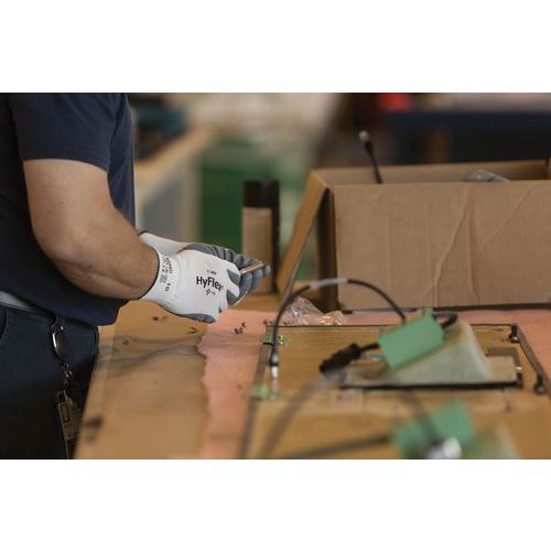 The nitrile foam coating on these HyFlex® 11-800 industrial gloves makes them exceptionally breathable, for everyday use with less irritation. The optimised ZONZ™ Comfort Fit Technology lining relieves tension, for PPE gloves with unrivalled comfort. They benefit from an exclusive washing process that removes impurities. Offer improved grip in dry or slightly oily conditions. They also feature ANSI/EN-compliant abrasion resistance for long-lasting wear. Breathable nitrile coating: Safety gloves that provide all-day comfort. ZONZ™ Comfort Fit technology: For PPE gloves with a tailor-made feel. .