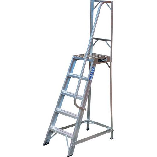 80 mm deep serrated treads. Comfortable 421 x 405 x 70 mm checker plate platform. Handrail supplied loose. Constructed from heavy-duty channel section aluminium. 3-year guarantee.