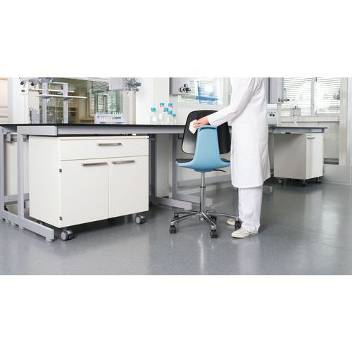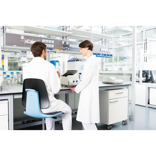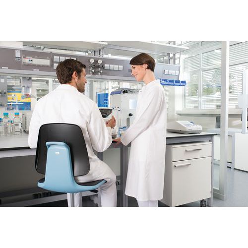 Workshop chair is suitable for clean rooms. Innovative ergonomic features: Follows all body movements. 3D-Flex functions on the seat edge and in the backrest. Easy to use thanks to the integrated handles. Great for use in laboratories. Washable and resistant to disinfectants.