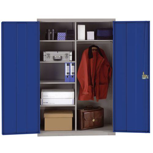Riveted steel cupboard with three adjustable shelves and a hanging rail.