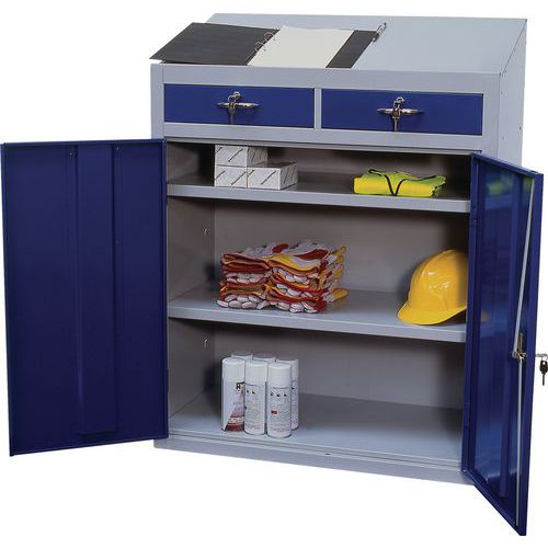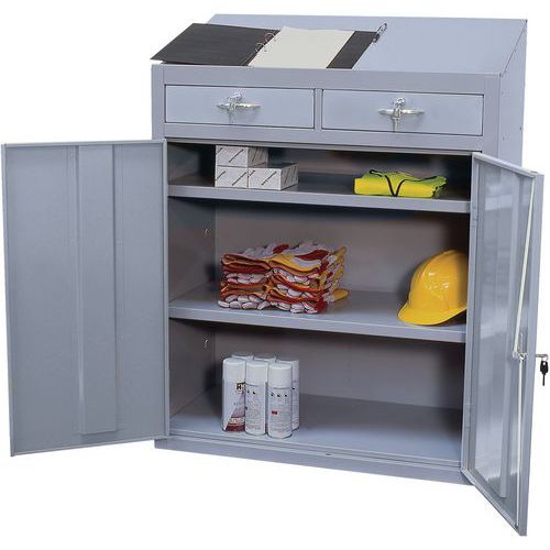 - The 3-point lockable cupboard has two adjustable shelves inside.