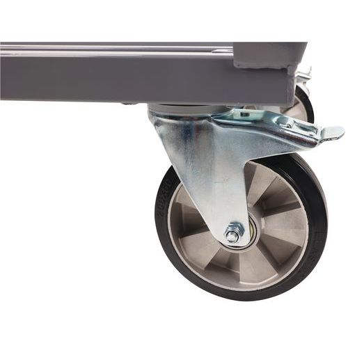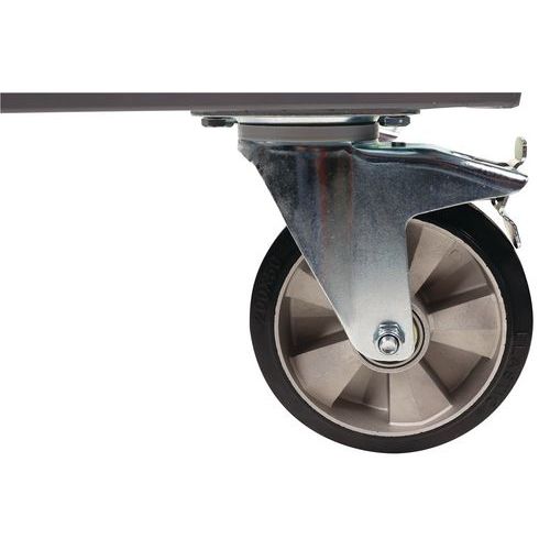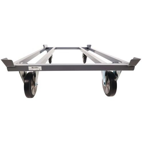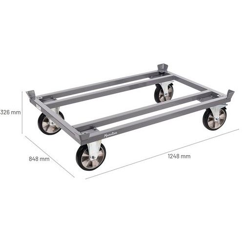 - Low steel dolly with ultra-robust structure. 4 stacking corners to hold the load in place.