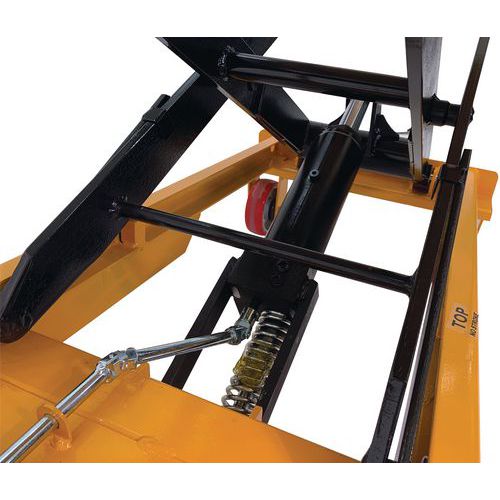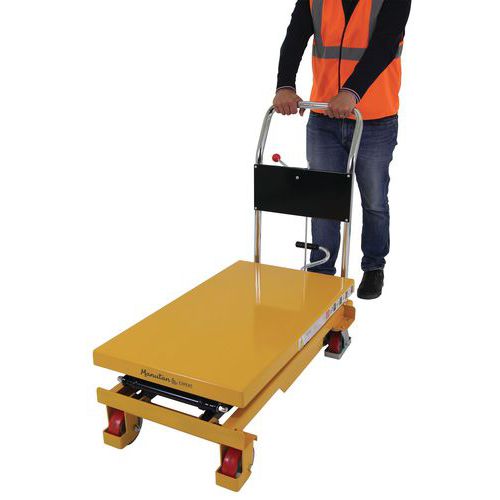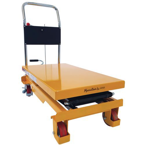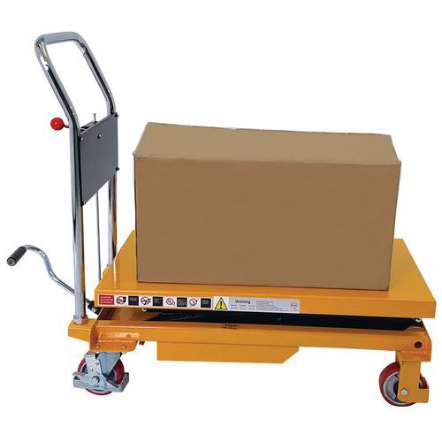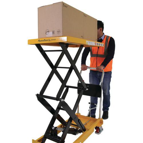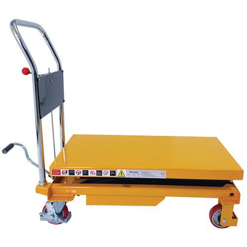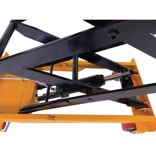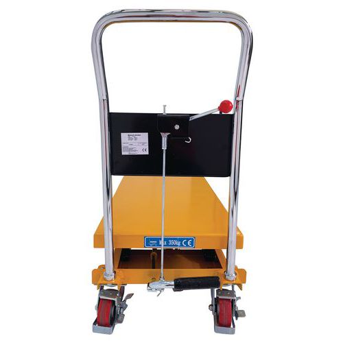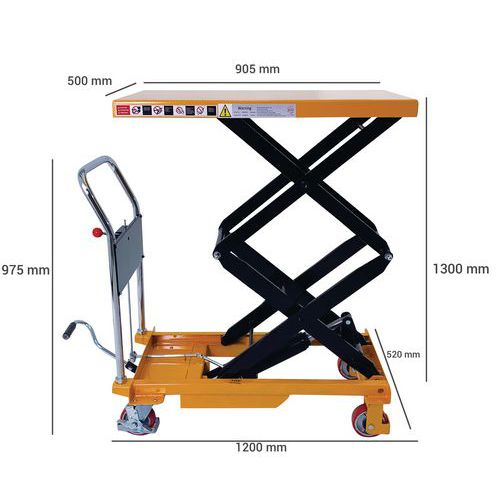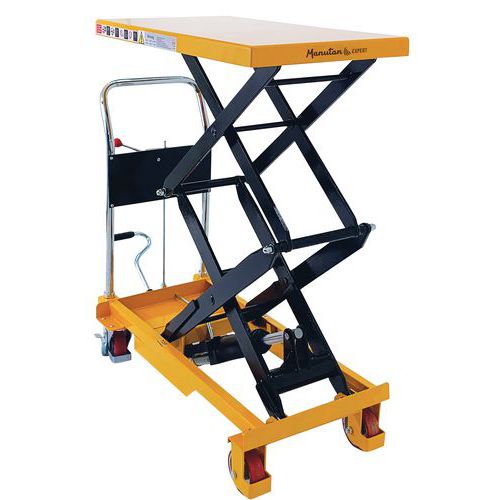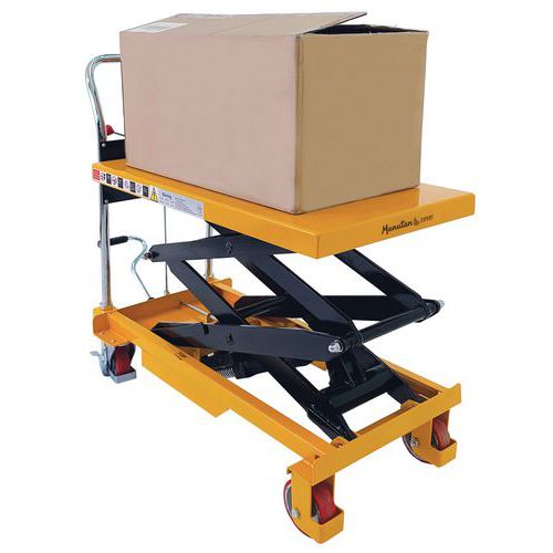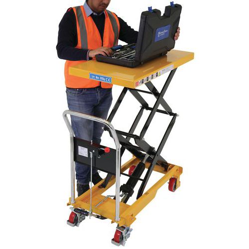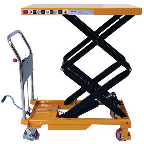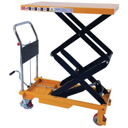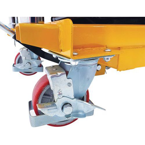 Double scissor manual lifting table. An ergonomic table for lifting, lowering and transporting loads of up to 350 kg. Ideal for moving heavy loads and bringing them to the required height. Light, low bulk and easy to transport, it needs only low maintenance. An essential tool to optimise productivity while prioritising the health and safety of your teams. Fitted with two fixed wheels and two swivel castors made of polyurethane.