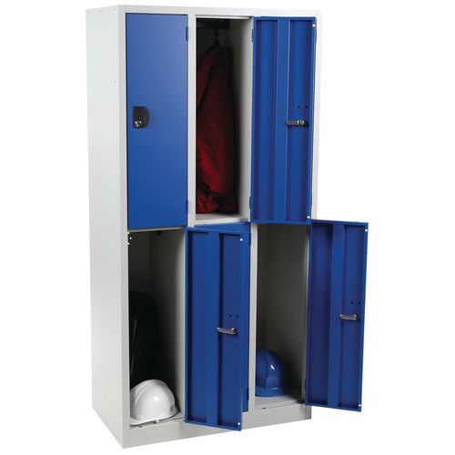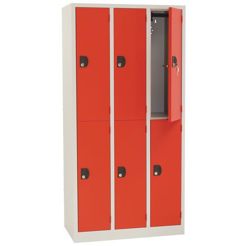 Multi-compartment locker with an attractive epoxy paint finish. With rounded corners for maximum safety. Locker with an ultra scratch-resistant coating. Plastic door stops for silent closure. Ventilation slot at the back of each compartment. Closing handle with label holder. Frame steel sheet thickness : 7/10e
