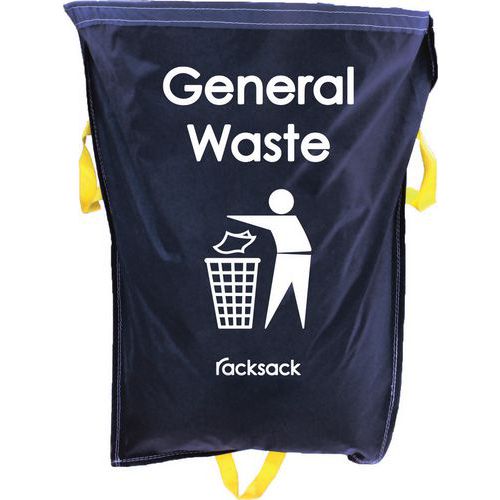 Choose from 6 printed designs on a blue sack. Delivers a simple, cost-effective system to keep you compliant with UK and EU waste segregation legislation. Can be put on most shelving/racking systems 900-1100mm deep with two strong S locators (supplied with each racksack). Designed to hang from end-of-aisle racking with an open ‘frog mouth’ to receive waste easily, yet its tapered design means it hardly encroaches on floor space. The design on the front states which type of waste should be deposited in the racksack®, allowing waste segregation to happen at the source. Three strong handles are woven into the edge of the sack, one on each side for carrying and one on the base, so it can be easily tilted from the base and emptied once full. Time and space-saving. The robust sacks are made of tough waterproof polyester. Call our sales team for more standard designs and bespoke company names or logos.