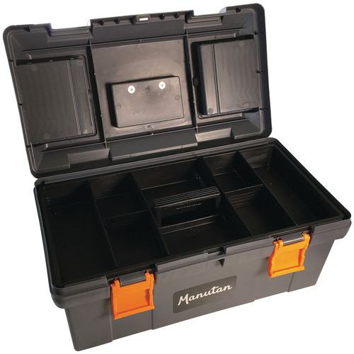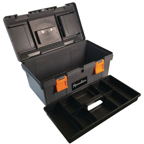 Comfortable PVC handles. Features two transparent compartments in the lid and one removable polypropylene tray. 10-year guarantee. All Manutan products are tested and approved by our teams.