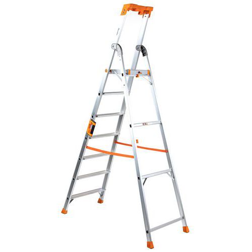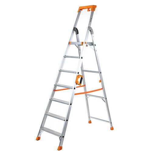 Multi-purpose tool shelf. Reinforced aluminium frame. Non-slip treads. Easy to carry and store. Complies with EN 131 and GS TUV Rheinland regulations. 10-year guarantee.
