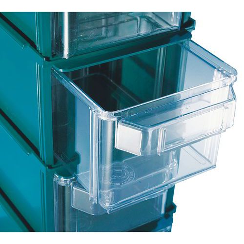 Stacking, connectible and free-standing. Transparent plastic bin-drawers. The side walls can be connected together using an attaching system. The top can be sealed with a lid. Made in the EU