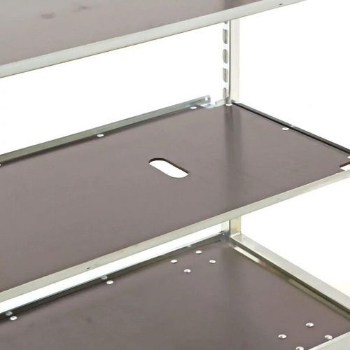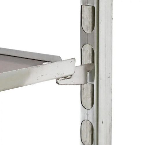 Equipped with an electrolytically galvanized steel frame: 4 removable stanchions/stiles 30 holes and 4 adjustable/removable shelves made of 6 mm waterproof plywood with a galvanized metal edge.