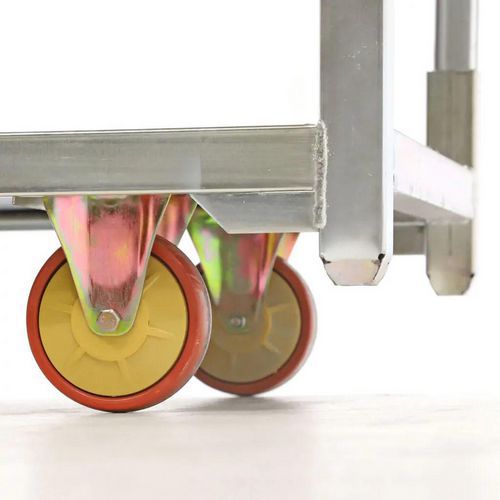 This warehouse trolley is known for its maneuverability due to its 2 fixed and 2 swivel wheels made of polypropylene with a diameter of 125 mm.
