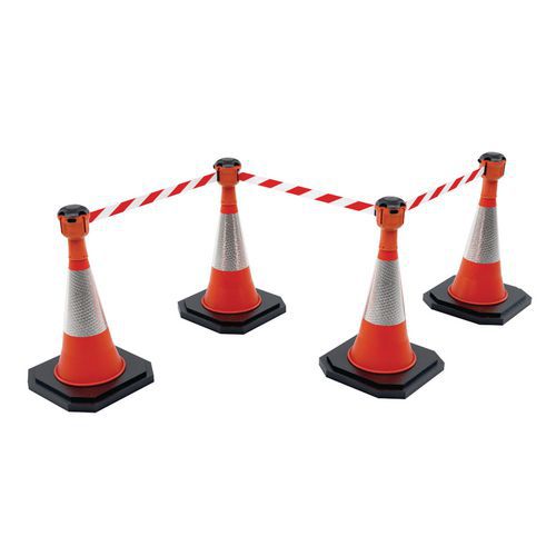Each unit is equipped with 9 metres of high-quality retractable red/white or yellow/black fabric tape.