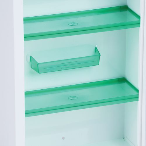 - The transparent plastic storage shelves can be adjusted to suit your storage needs.