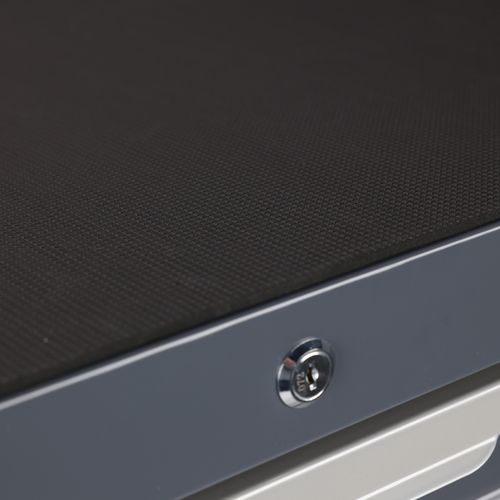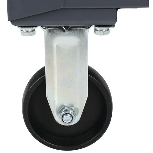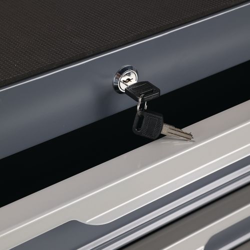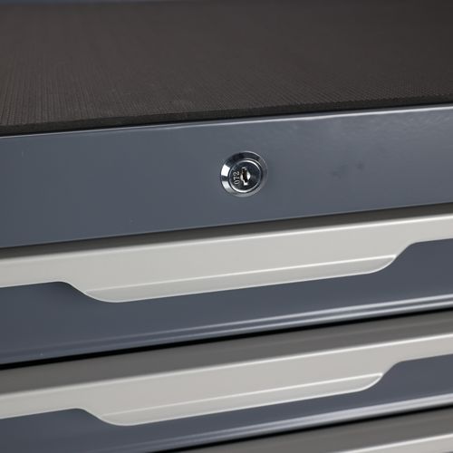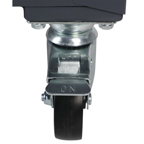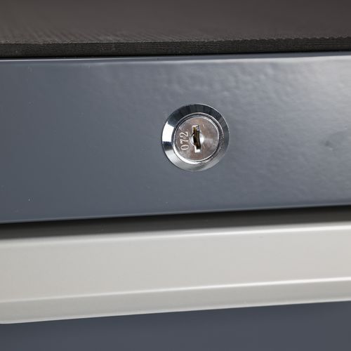 Robust workshop trolley with steel frame, RAL 7015 slate grey colour. Very secure with central key-locking system. Stable: optimised wheels with 2 fixed + 2 swivelling with brake. Excellent user comfort with a handle on one side.