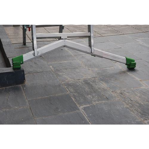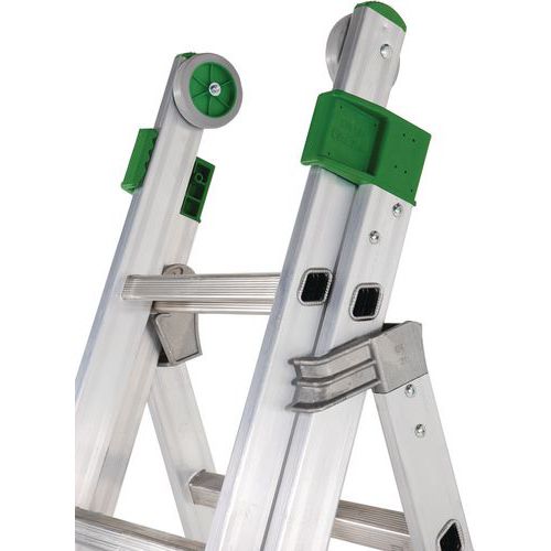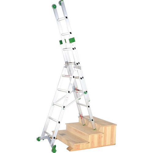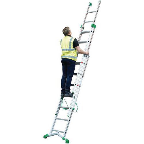 Offers four ladder types in one: triple extension ladder, A-frame step ladder, extended step ladder and stairwell ladder. A levelling safety base gives the ladder added stability. Aluminium locking stays give the ladder extra strength. The box section stiles are large and have twist-proof rung connections. Deep and comfortable rungs reduce fatigue. The guides are strong and nylon coated, for smooth handling. There are built-in wall wheels to help the user place the ladder safely. Telescopic stabiliser for use on uneven surfaces. Complies with all EN 131 standards.