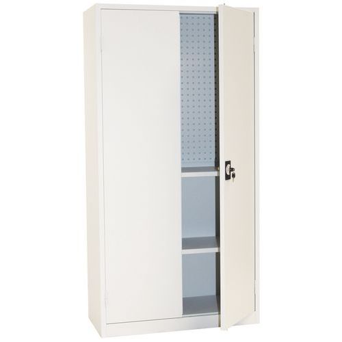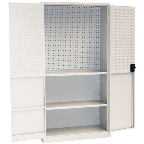 Comes with 2 adjustable shelves, 1 assortment of plastic trays and no. 2 hooks. Tool panel with square holes (dimensions: 10 x 10 mm, distance between the holes: 38 mm).