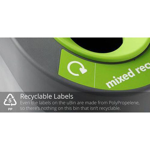 Range of revolutionary recycling bins made from 100% recycled plastic. Includes recycling stickers.
